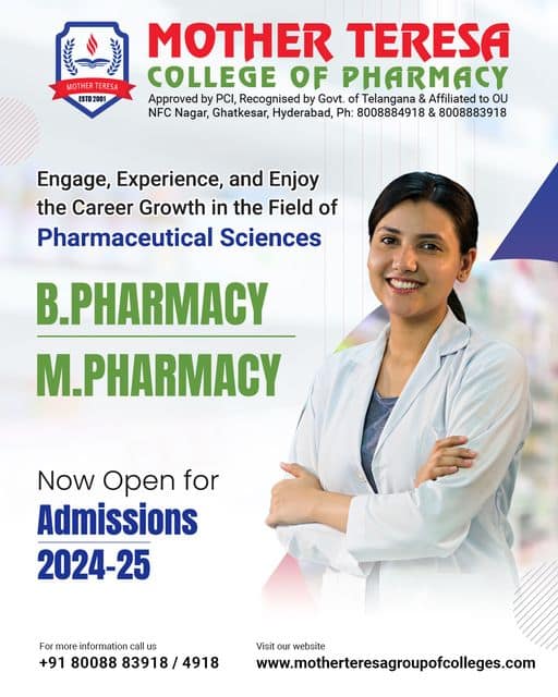Discover top Pharmacy Colleges in Hyderabad at Mother Teresa Group. Best M.Pharmacy Colleges In Hyderabad. Unlock your potential.