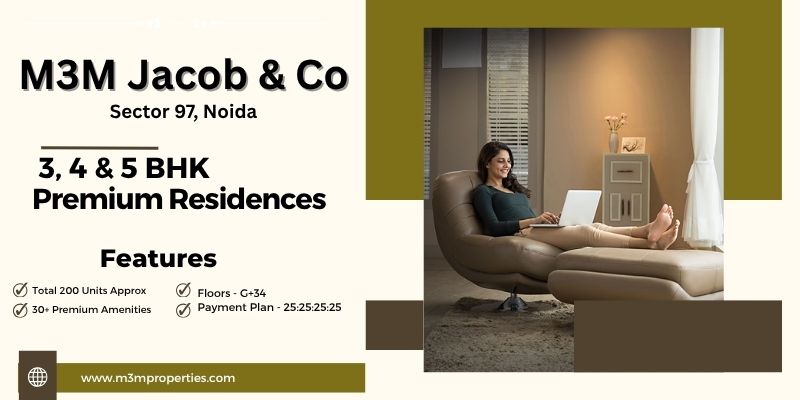 M3M Jacob & Co is a luxury residential development in Sector 97, Noida near Delhi and located on the Noida Expressway. The project has 3, 4 & 5 BHK luxury apartments starting from Rs. 8.75 Cr onwards. UP RERA – approved, g+34 floors, 200+ units and 30+ premium amenities. EOI begins at ₹25 Lakhs. High Potential for Appreciation.